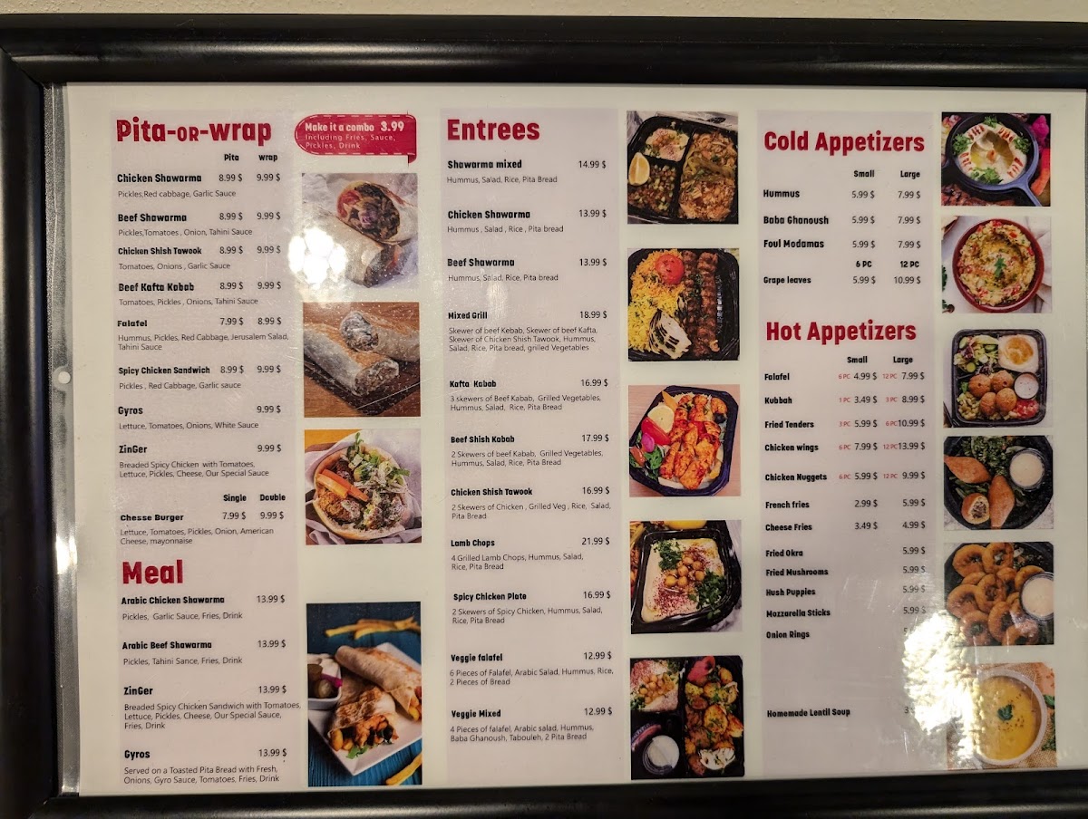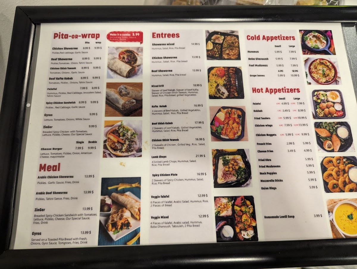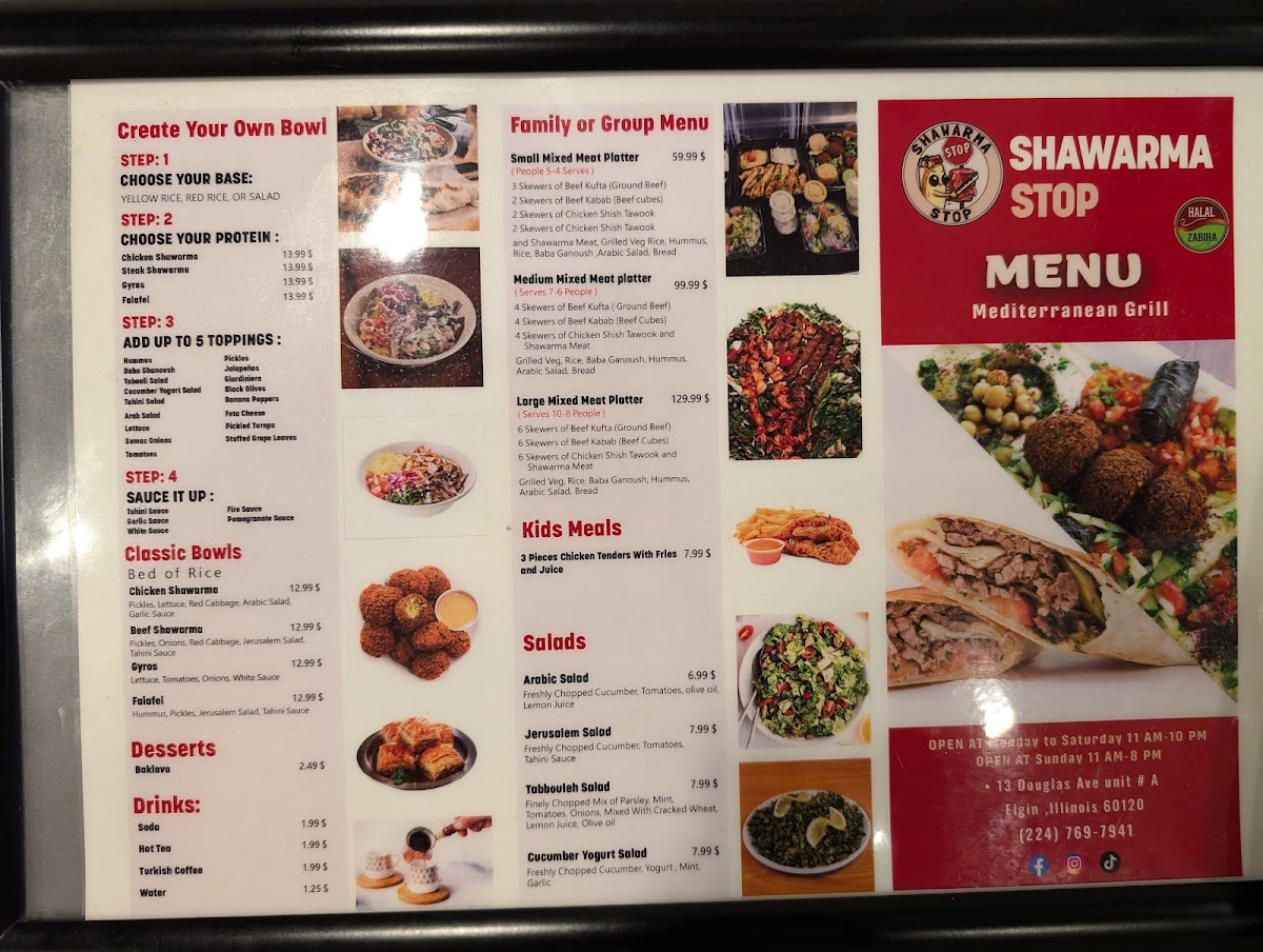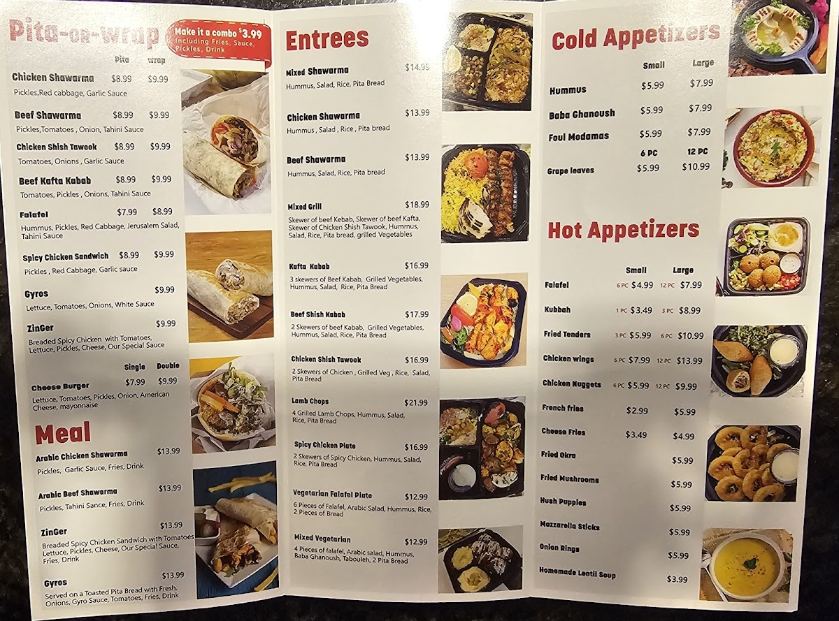 ( Serves 8-10 People ) 6 Skewers of Beef Kufta (Ground Beef) 6 Skewers of Beef Kabab (Beef Cubes) 6 Skewers of Chicken Shish Tawook Grilled Veg, Rice, Baba Ganoush, Hummus, Arabic Salad, 8 pita Bread